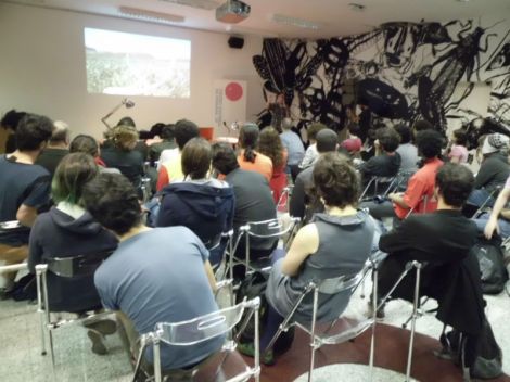 3. Outra visão geral da oficina, no contraplano. O vídeo que está sendo exibido é um trecho do Open Land, de Sebastian Pichelhofer.
