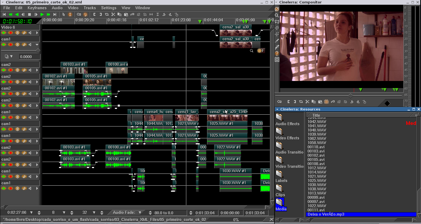 A imagem que vemos acima é da linha do tempo do Cinelerra, editando em arquivos proxy e antes da correção de cores. Falaremos mais sobre o processo todo durante a segunda oficina do CCE_SP, mas, fazendo um diário de bordo, foi bastante importante passar por este processo.