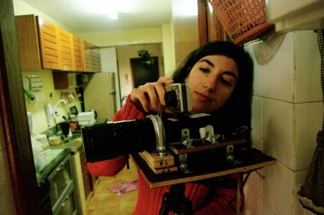 A Natália, fazendo uma equivalência entre o que víamos no computador com o stream ao vivo do GStreamer e a camerazinha da minha irmã, que usamos como “viewfinder”. Há algumas formas de se fazer o monitoramento de gravação com a Elphel, mas o mais prático mesmo é apelar e montar uma câmera no buraco de tripé da Elphel – assim temos uma visão quase exata do que está sendo captado, já que ambos os sensores estão quase na mesma posição.