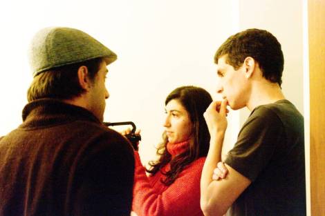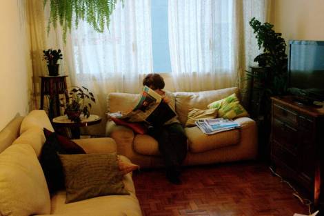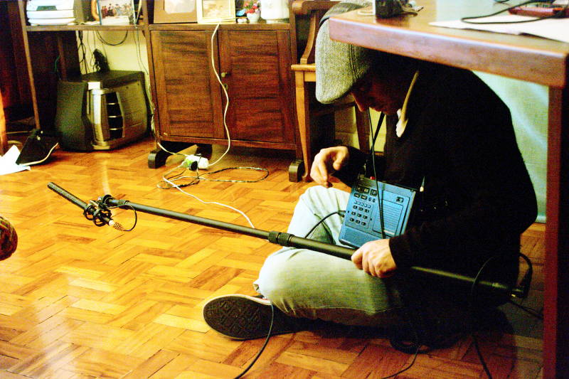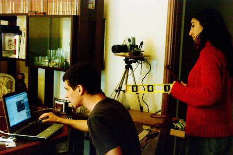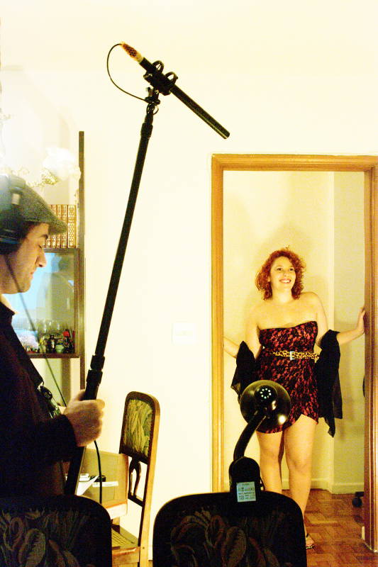 As cenas da sala. Na primeira, temos uma visão quase idêntica à que está sendo captada pela câmera – neste caso, tirada com a minha máquina fotográfica. Esta imagem, junto a alguns outros testes, me fez concluir que a Elphel possui um ISO nativo de cerca de 100, o que nos dá uma ótima ideia de por onde começar em termos de iluminação. Nossa brilhante atriz, Lucélia, lê o jornal, como apareceria em cena. Abaixo, está o Jayme com o nosso equipamento de áudio, um gravador Marantz e um microfone Sennheiser.