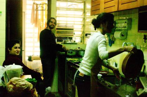 Nossa câmera passando perigo! Aqui estou eu, com a parte nerd de avaliar se está tudo certo. Mais especificamente, estou preocupado se os scripts que colocamos no HD externo, acessado pela Elphel, estão rodando direito. Esses scripts facilitam muito a nossa vida na hora de gravar em campo! A câmera, por sua vez, está em um tripé bambo, em cima de uma tábua de passar roupa – se você olhar bem, vai ver que há dois pesos de 1kg em uma sacola, para mantê-la onde está. A Natália segura nossa claquete improvisada – afinal, cinema de guerrilha é assim!