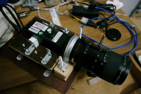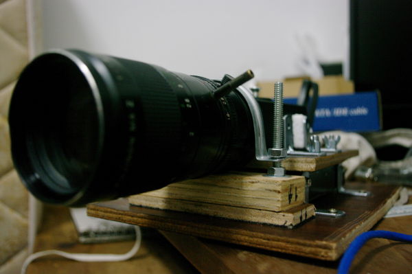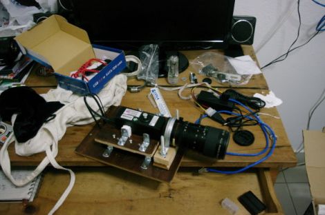 Continuando a postar o conteúdo multimídia, aí vão as fotos que fizemos do nosso primeiro protótipo de setup da Elphel. Precisávamos de um jeito para juntar todas as coisas – câmera, HD externo, lente e cabos – em uma plataforma só, de modo que tudo isso pudesse ficar balanceado em um tripé.