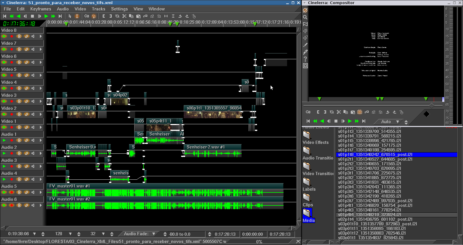 Pois é, ontem à noite, o Renato veio em casa e fizemos vários ajustes no filme, em especial nas tonalidades de algumas cenas. Com tudo processado e reprocessado, com o áudio finesse do Renato, repassado no UFRaw, nos scripts de automação, com os efeitos de Blender reafinados, e um monte de arquivos TIF gerados, hoje pela manhã passamos pelo momento de botar toda essa salada no Cinelerra para o render final.
