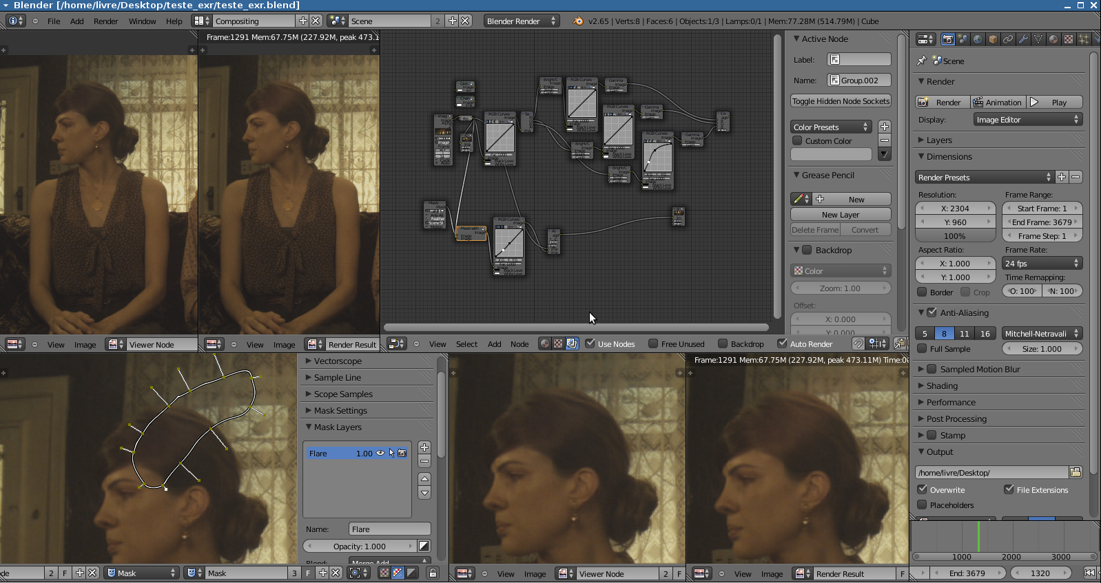 Os primeiros testes com a pós no Blender começam a mostrar os resultados. Nesta cena, temos um flare fixo na altura dos cabelos da Laís. Com a possibilidade de fazermos máscaras, ele fica bem mais suave, e praticamente desparece. No caso de uma câmera em movimento, essa máscara poderia ser vinculada a um rastreamento (camera tracking), fazendo com que ela seguisse o foco de interesse.
