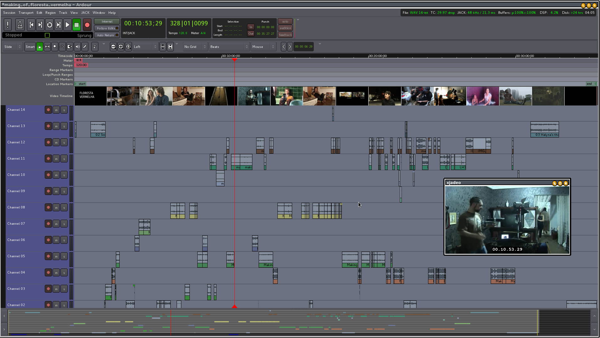 Por fim, usando o ::blue_velvet::, exportamos a trilha de áudio para o Ardour, que as lê exatamente do mesmo modo que eram exibidas no Blender. Note que já coloquei a trilha de vídeo no projeto do Ardour, o que a fez aparecer linha do tempo e exibir a janelinha que exibe a montagem. Deste ponto, é fazer o tratamento de áudio enquanto o montador sai dos proxies para a resolução integral (no caso, 1080p) e finaliza as cores.
