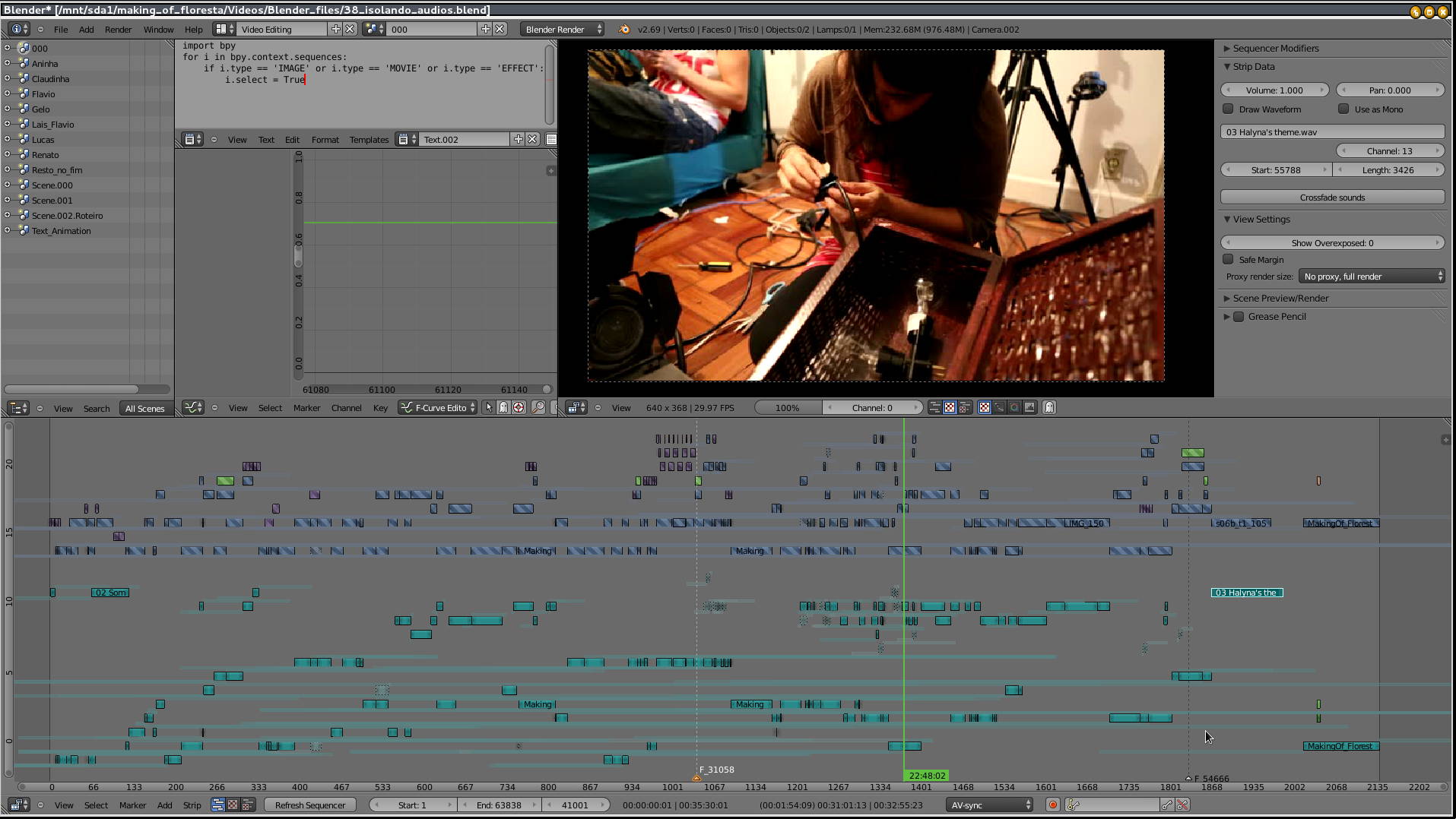Agora que lançamos o filme online, as atenções se voltaram definitivamente em acabar o making of, algo que vem se encaminhando já há muitos meses, mas que sempre parou por diversos motivos. Primeiro, precisávamos de tempo para ver o material. Depois, a Vanessa e eu achamos que a linha narrativa ficaria melhor com algumas entrevistas. Finalmente, surgiu a oportunidade de desenvolver o ::blue_velvet:: e exportar a linha do tempo de áudio do Blender direto para o Ardour (e isso aconteceu mais ou menos ao mesmo tempo que a Vanessa conseguiu um emprego fixo).
